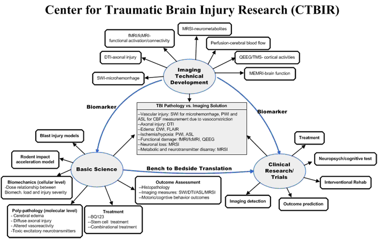 CTBIR has at its core both human and animal magnets (1.5T/3T human and 4.7T/7T/12T animal systems) which provide state-of-the-art imaging capabilities. Ongoing research conducted within our MR Research Facility (MRRF) has been centered on advanced imaging techniques such as susceptibility weighted imaging (SWI), diffusion tensor imaging (DTI), MR spectroscopic imaging (MRSI), perfusion weighted imaging (PWI), manganese-enhanced MRI (MEMRI), morphometric imaging, functional connectivity MRI (fcMRI), quantitative volumetry quantitative EEG (qEEG), evoked and eventrelated potentials (EP/ERP) and transcranial magnetic stimulation (TMS). Another strength is the ready availability of a blast models for war personnel. Standard methods such as molecular biology techniques, neural behavioral tests of animal models, neuropsychological and clinical assessment, are also available. The new CTBIR will provide the environment for testing new technologies and new clinical translational research directions with applications in public health and in the military as well. This will allow for "bench to bedside" research with the main goal being better treatment for TBI. The framework of research at our center is depicted in Figure 1 where specific ongoing projects are listed. The three major directions of research in TBI will include: basic science research to reveal physiological, pathological and neurobiological mechanisms of TBI with imaging; development of imaging methodology per se to better serve as biomarkers for TBI in the clinical and basic science domains; and clinical and translational research to improve clinical and functional outcome prediction and enhance treatment with imaging.